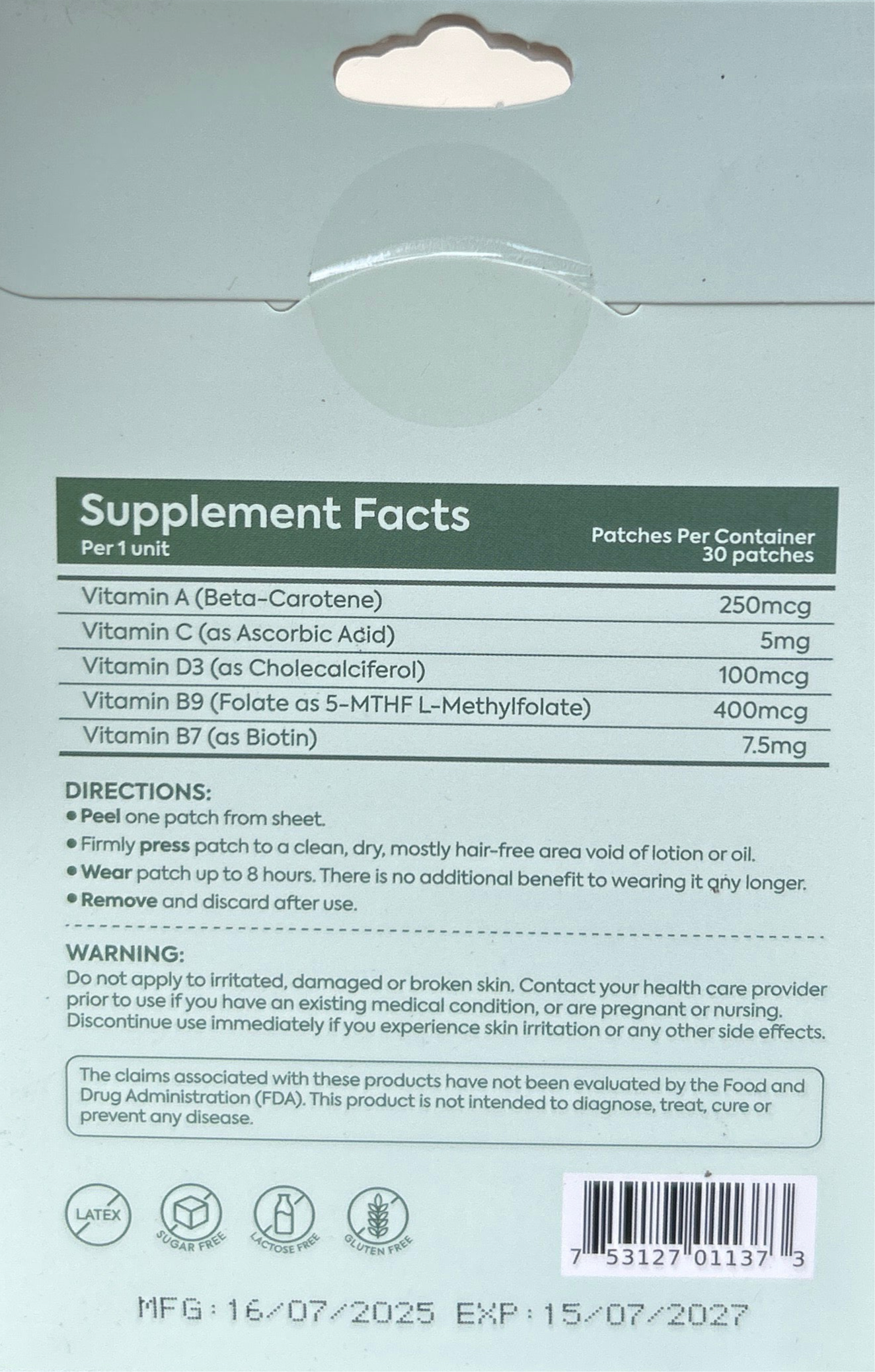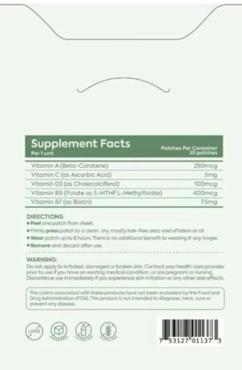 Each box contains 30 patches, each 3” x 3”, designed for up to 8 hours of continuous nutrient delivery. Simply peel, apply, and wear for effortless daily support.